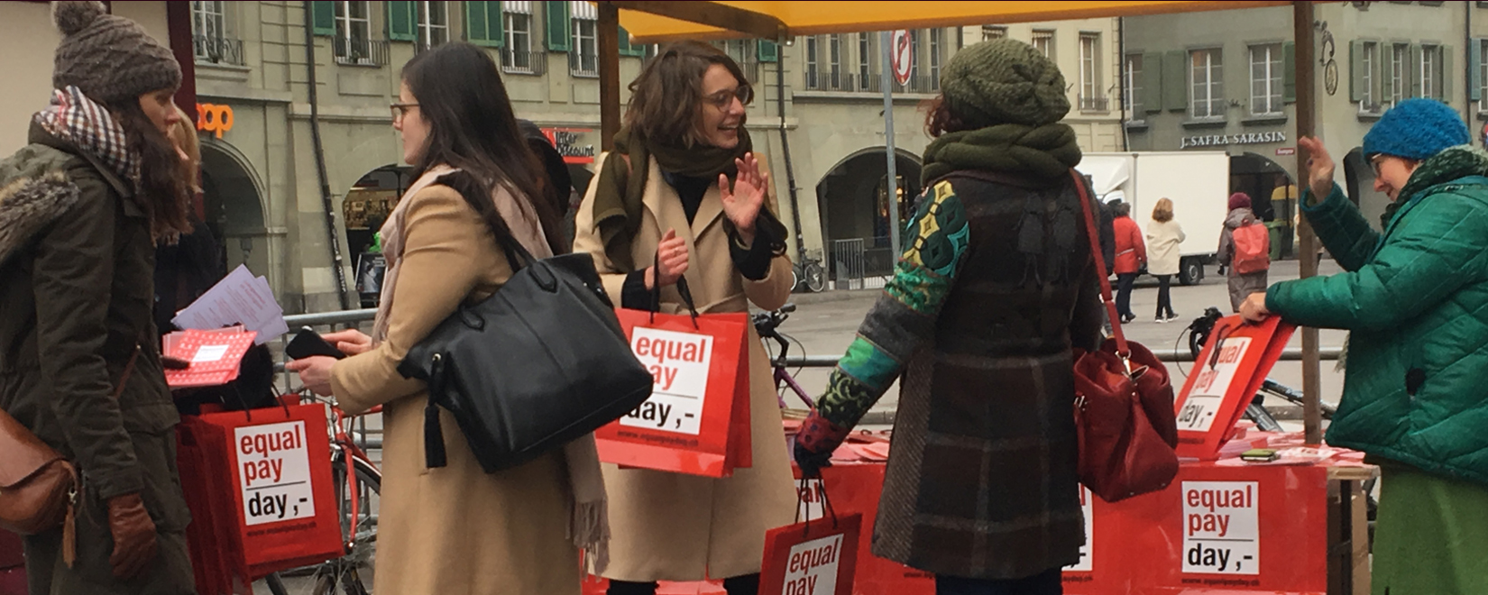 In verschiedenen Städten in der ganzen Schweiz werden an diesem Tag die berühmten Equal Pay Day Taschen verteilt, damit die breite Bevölkerung für das Thema Lohngleichheit sensibilisiert wird. Frauen sollen ermutigt werden, ihren Lohn besser zu verhandeln und Männer sollen erkennen, dass auch sie ein Interesse an einem gleichen Lohn für gleiche Leistung haben.